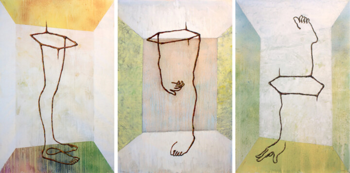“Cómplices” indaga en las tensiones contemporáneas entre separación y conexión, entre frontera y contacto. La obra, desde su título, alude a una relación íntima y ambigua, donde lo compartido no está exento de conflicto. Este doble juego entre lo que se une y lo que se separa se articula visualmente mediante una composición minimalista: líneas sinuosas que delinean una mano y un pie, figuras humanas básicas, pero cargadas de simbolismo, emergen de campos cromáticos vibrantes (rojo, amarillo, verde), cada uno delimitado con bordes irregulares, como si fueran territorios de una cartografía emocional o política.